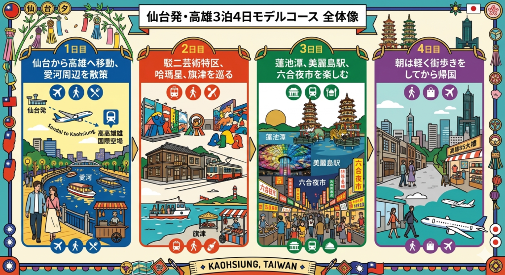 このモデルコースは、初めての高雄旅行でも回りやすいことと、港町の景色、アート、ローカル感を3泊4日でバランスよく楽しめることを重視して組んでいます。